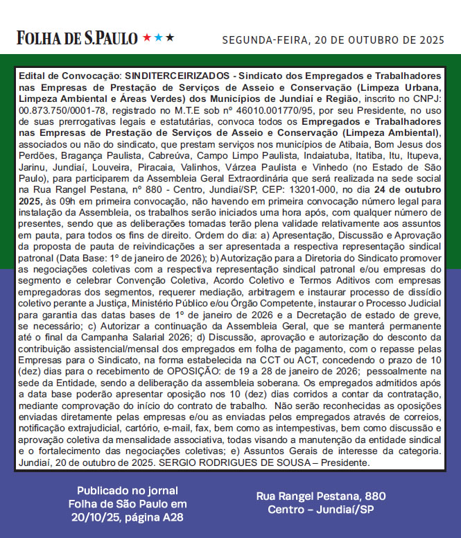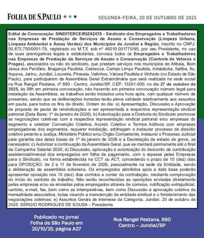 Edital de Convocação 2021 – SINDITERCEIRIZADOS - Sindicato dos Empregados e Trabalhadores nas Empresas de Prestação de Serviços de Asseio e Conservação, (Limpeza Urbana, Limpeza Ambiental e Áreas Verdes) dos Municípios de Jundiaí e Região, inscrito no CNP